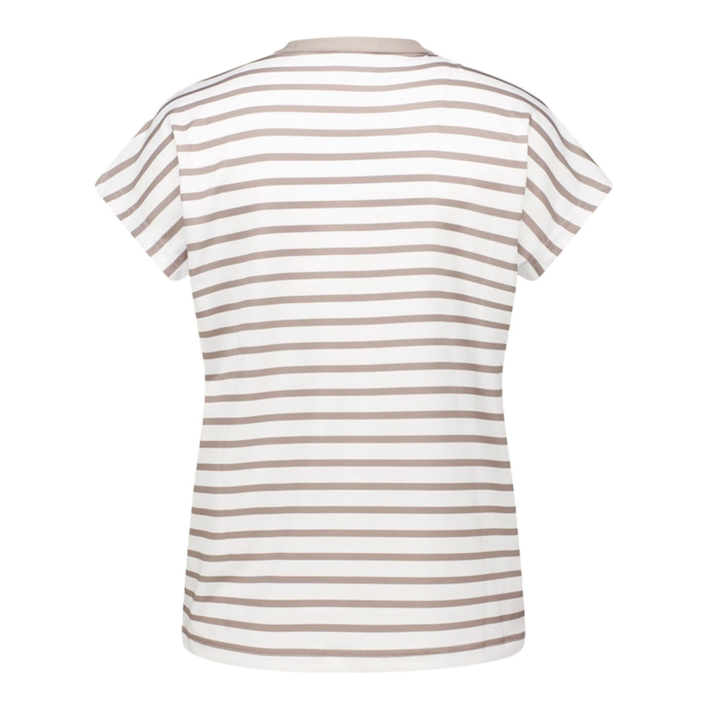 - Elegancki wzór w poziome paski z akcentami przy kołnierzyku nadaje sportowy wygląd.