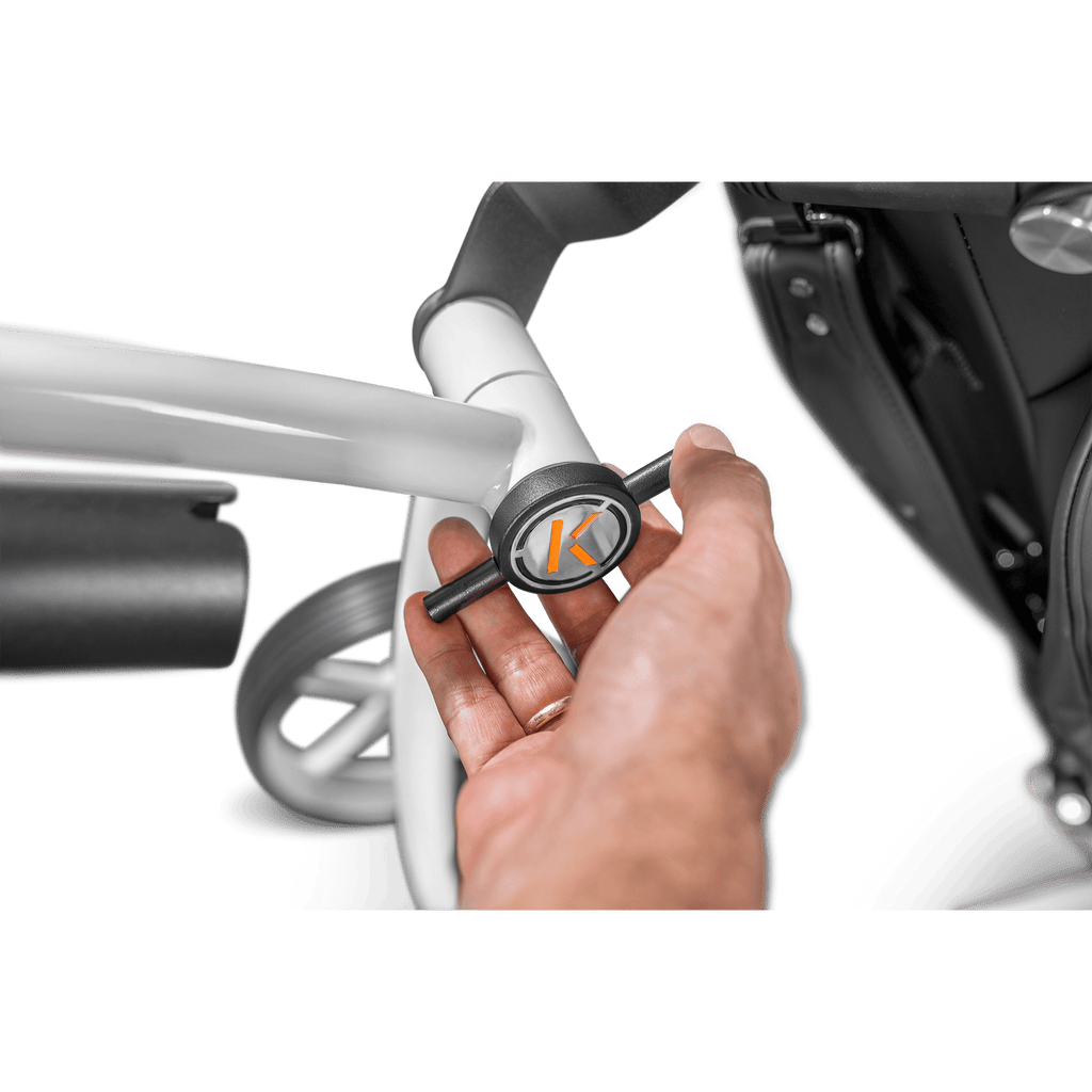 Die auf beide Antriebsräder wirkende elektronische Feststellbremse bringt ein Höchstmaß an Sicherheit mit sich. Darüber hinaus punktet der Kiffe K5 E-Trolley mit der praktischen Geschwindigkeitsmemory-Funktion: Dementsprechend lässt sich die zuletzt eingestellte Geschwindigkeit durch die Betätigung des Start-/Stopp-Schalters sofort wieder abrufen. Damit Sie die wichtigsten Daten jederzeit überprüfen können, bietet der Kiffe K5 E-Trolley zwei unterschiedliche Kontrollanzeigen: Mit der Motor-Aktivitätsanzeige haben Sie jederzeit die technische Performance im Blick, während Ihnen die Akku-Kapazitätsanzeige konkrete Anhaltspunkte für die verbleibende Nutzungszeit liefert.
